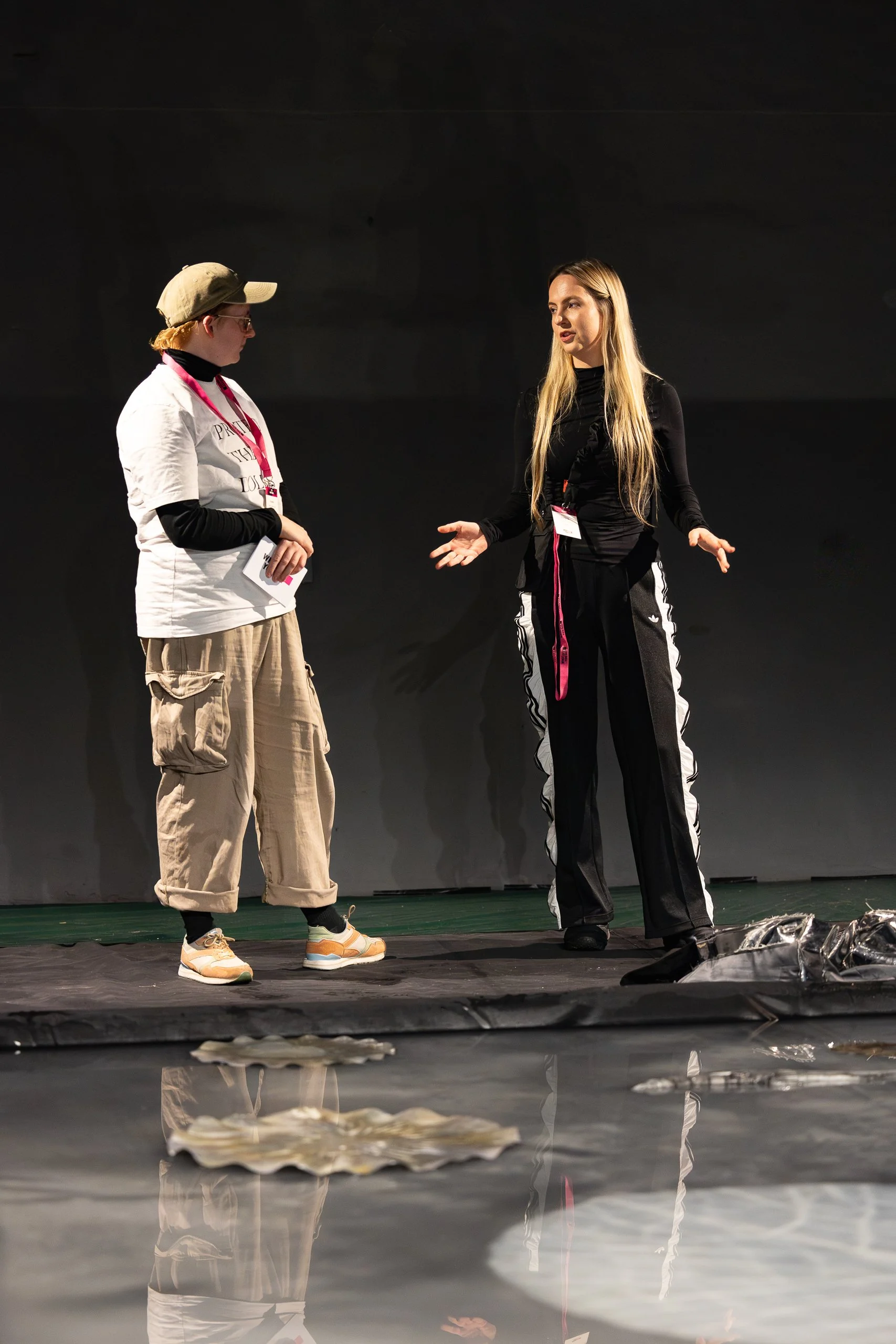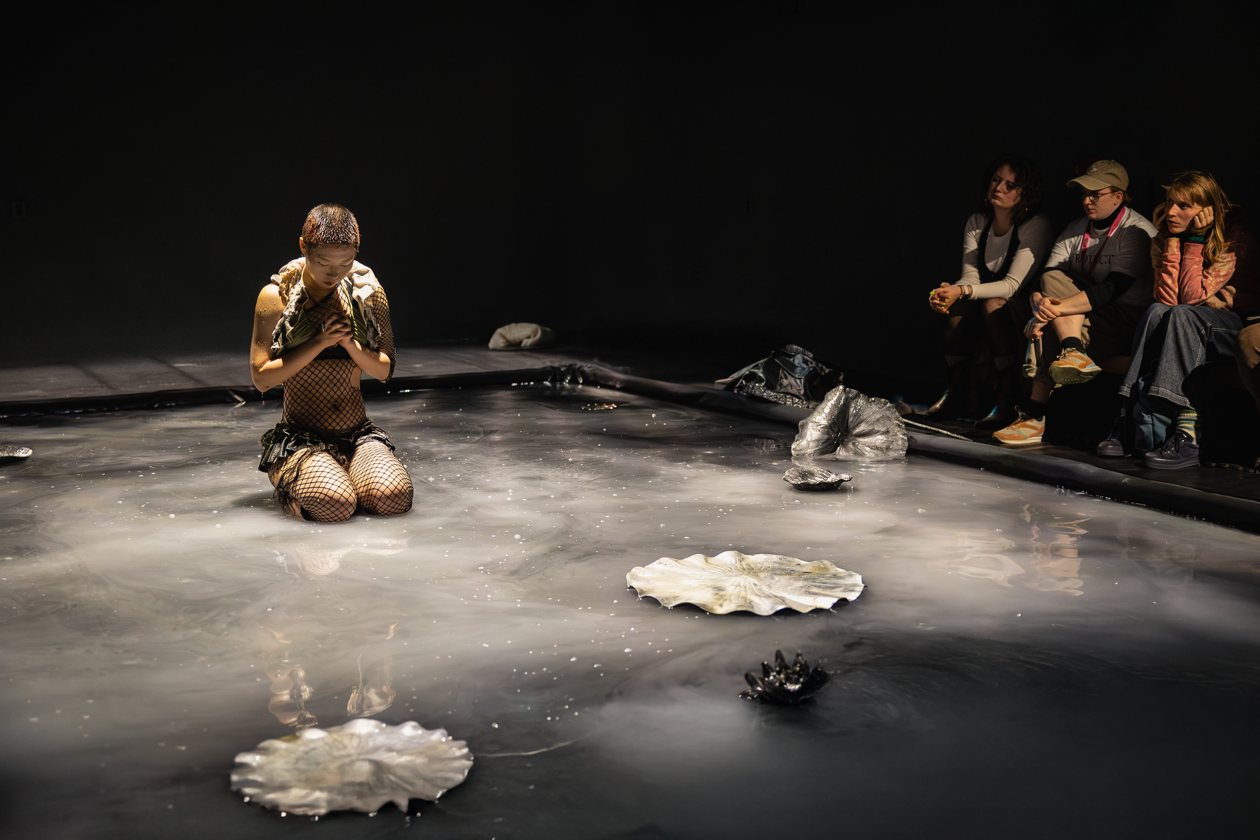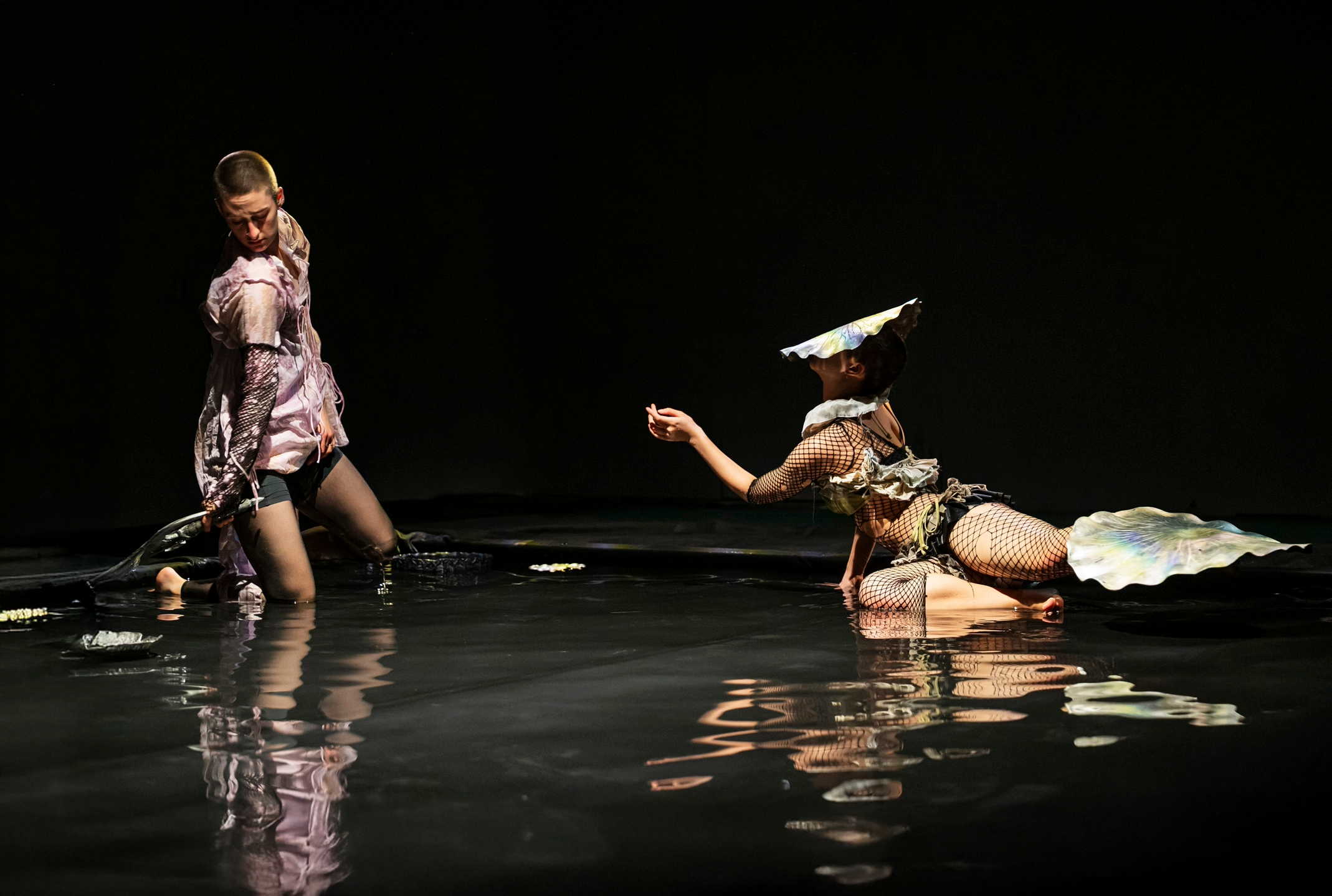 Two queer Children are discovering the healing power of water within a mythical swamp. Here, they manifest their freedom, free from the oppressive patriarchal powers of Zeus. Old paradigms fade, but not without obstacles. Through their transformative powers, the children will create a fluid world in which they attempt to restore the balance between humanity and nature. The knowledge of their ancestors is found here in breath and rhythm, and is discovered through the body, water, and installation. The friction between forgotten histories and the rise of technological humanity forms a key starting point of their journey into this mythical swamp.